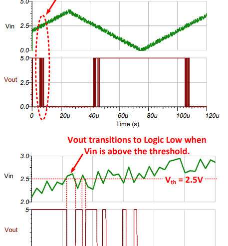 Output of a Comparator without Hysteresis: showing Multiple Transitions near Threshold: